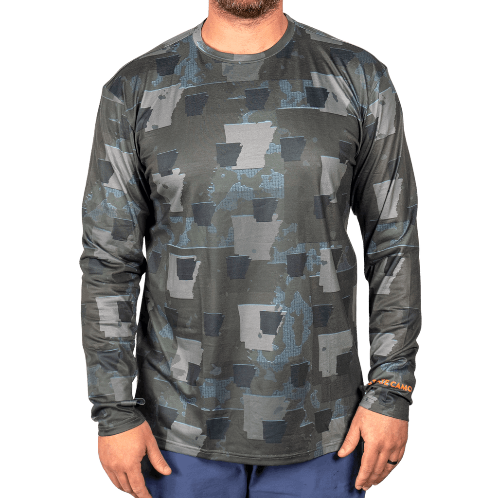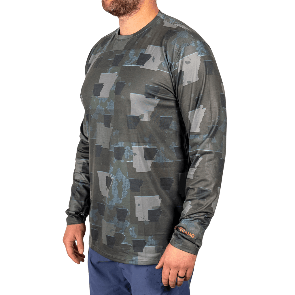 • Arkansas Camo Pattern • Moisture Wicking Fabric Technology. • Lightweight & buttery soft feel • 4-Way Stretch allowing maximum movement & performance • Thumbholes in sleeve