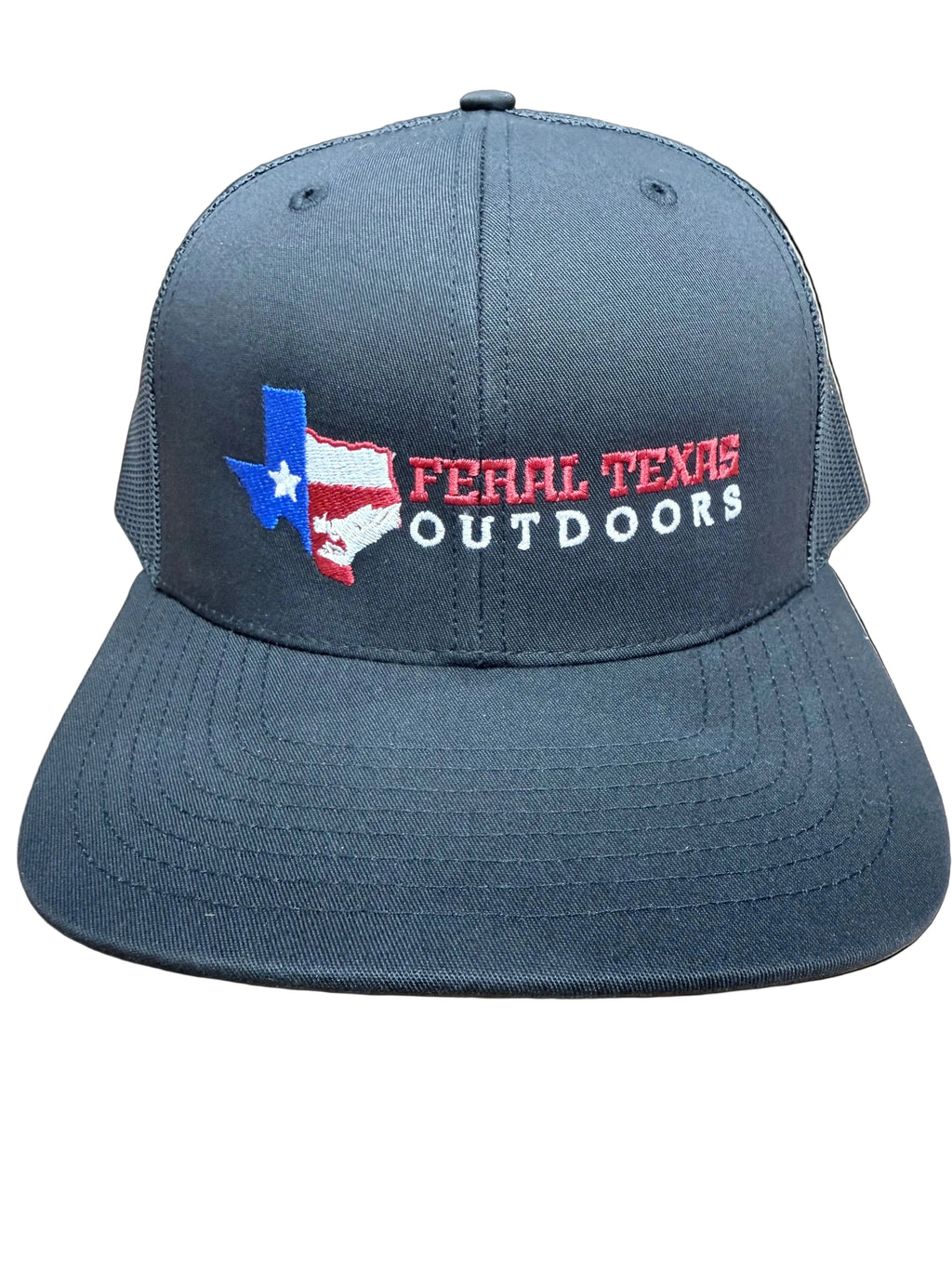 Richardson Black hat with embroidered Feral Texas Outdoors colored logo.